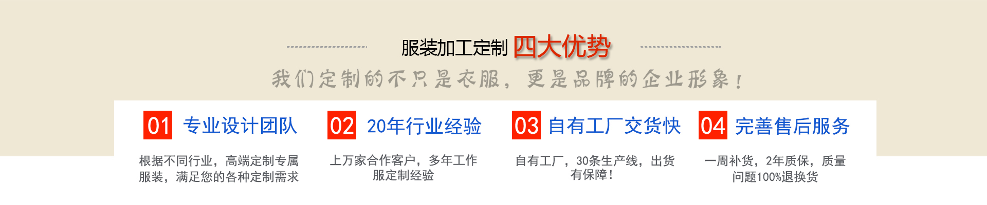 服裝加工網(wǎng)是一家及設(shè)計、生產(chǎn)、銷售為一體的專業(yè)服裝生產(chǎn)型企業(yè), 根據(jù)客戶需求定制西服襯衫工作服大衣棉服等產(chǎn)品,近二十年工作服職業(yè)裝定做經(jīng)驗積累, 工期短交貨及時,免費提供團體定制上門量體服務(wù),送貨上門,免費修改,完善的售后服務(wù), 滿足您的各種定制需求!